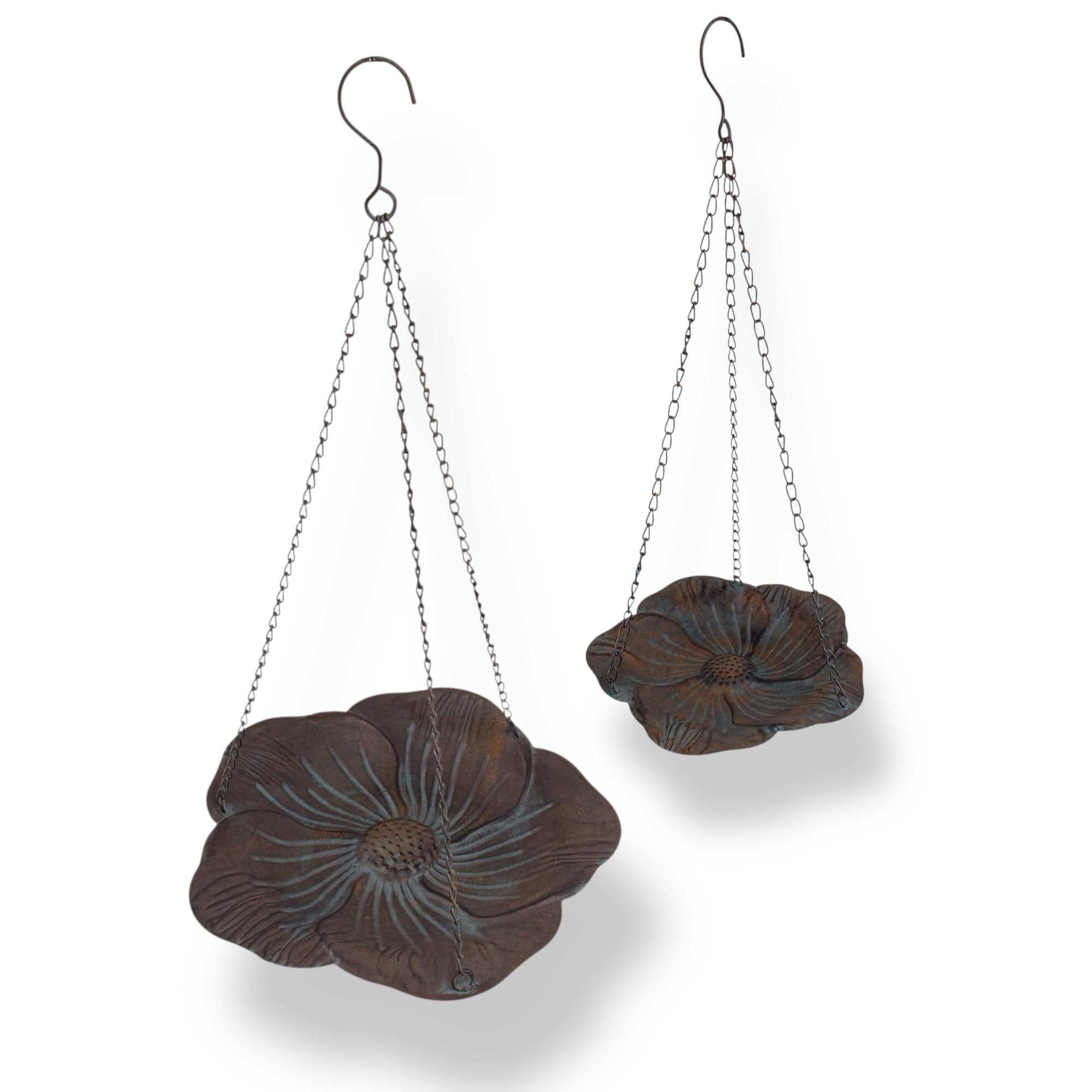 Die Tränken werden mit stabilen Metallketten und Haken geliefert und lassen sich einfach an Ästen, Pergolen oder Wandhaken aufhängen.