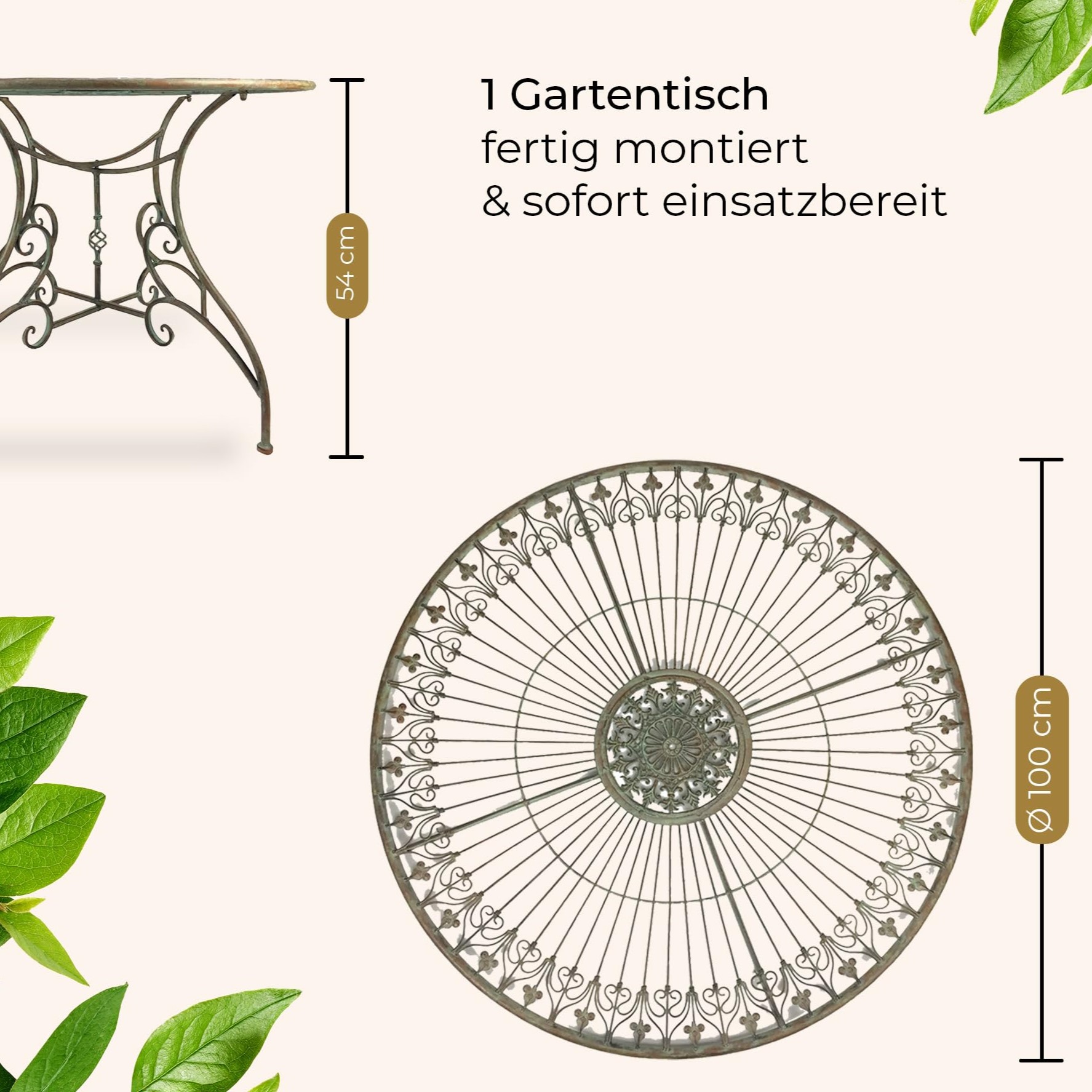Runde Gartentische schaffen eine besonders kommunikative Atmosphäre, benötigen jedoch oft viel Platz bei der Lagerung. Der Granada Gartentisch löst dieses Problem durch seine klappbare Konstruktion, ohne auf Stabilität oder Design zu verzichten. Die antikgrüne Oberfläche mit dezenten Farbfacetten unterstreicht den klassischen Landhausstil und macht den Tisch zu einem dekorativen Mittelpunkt im Außenbereich.